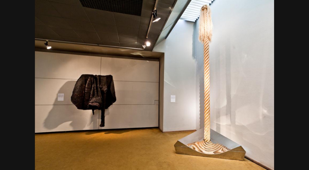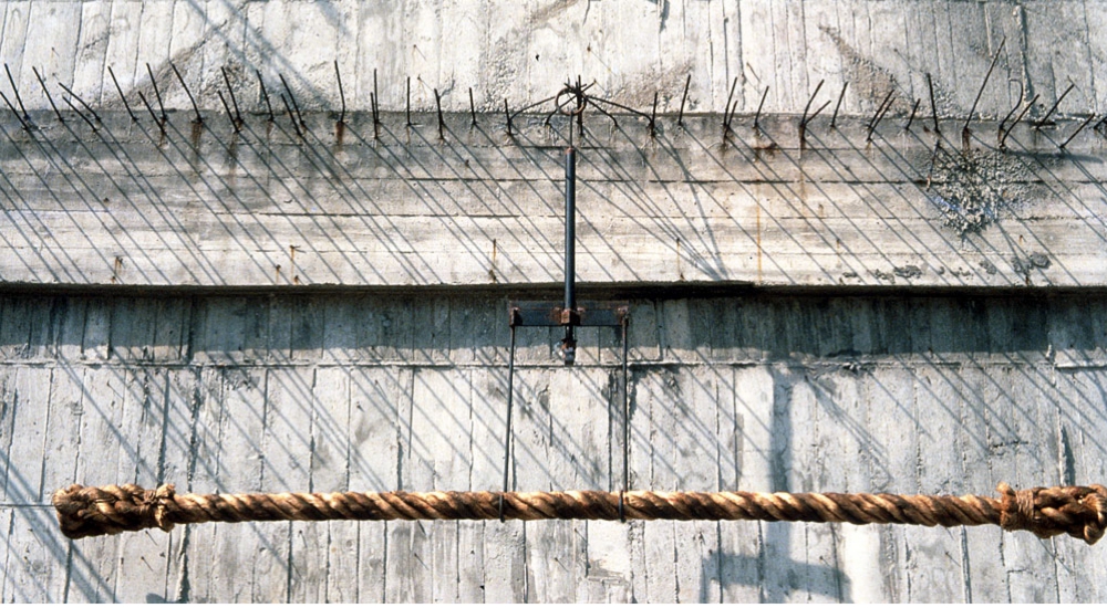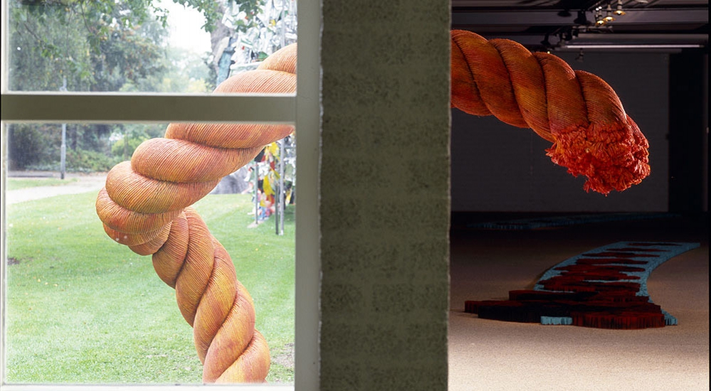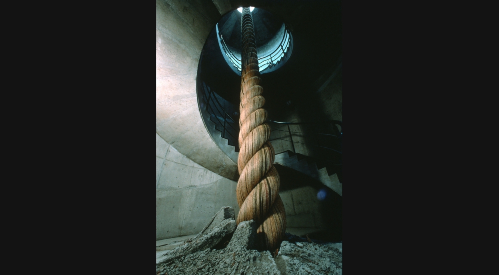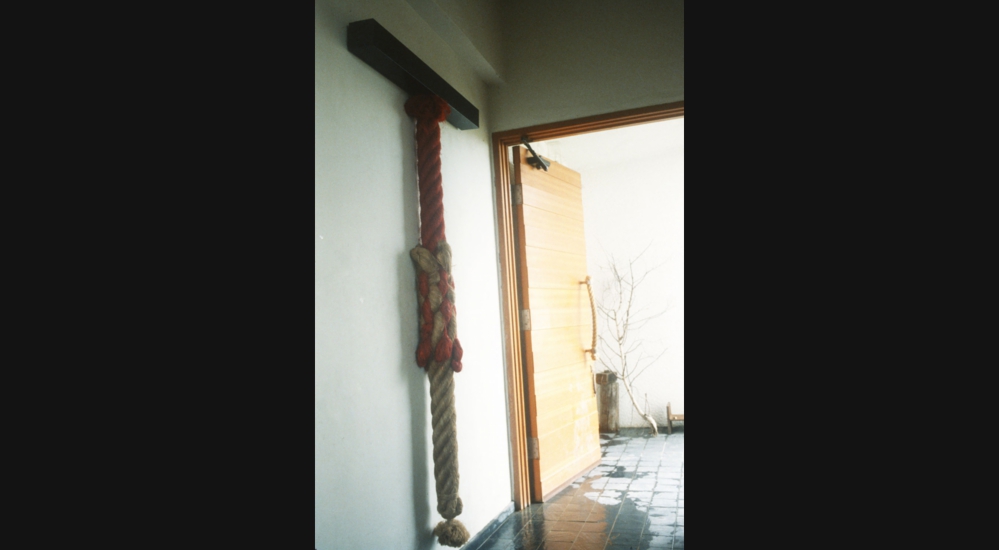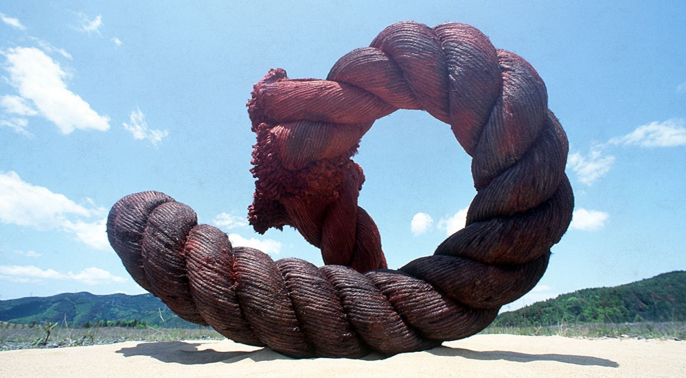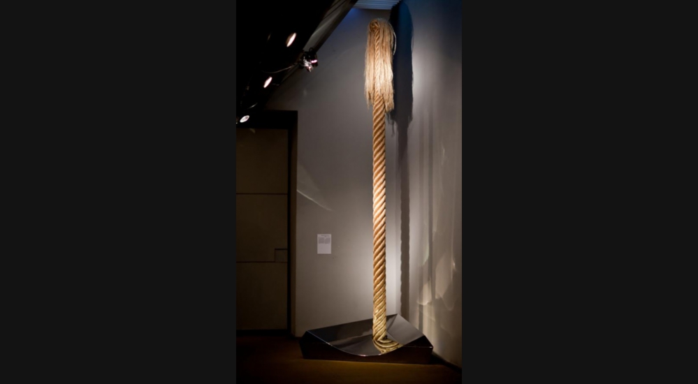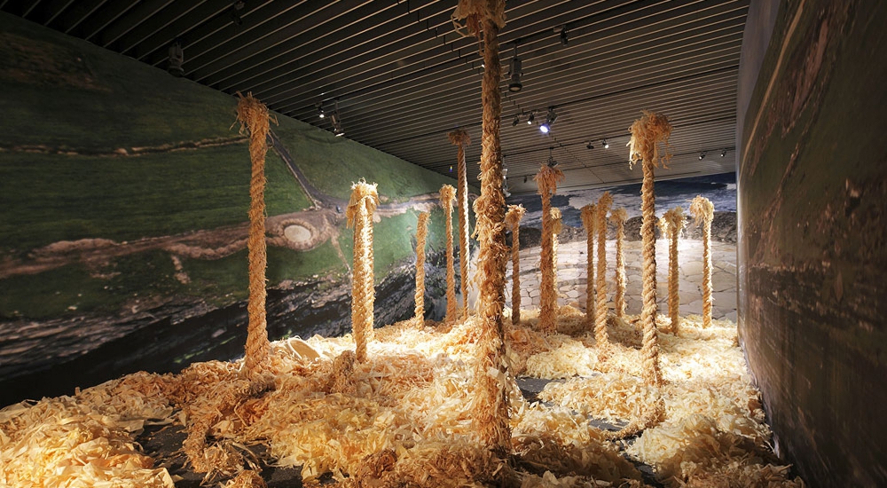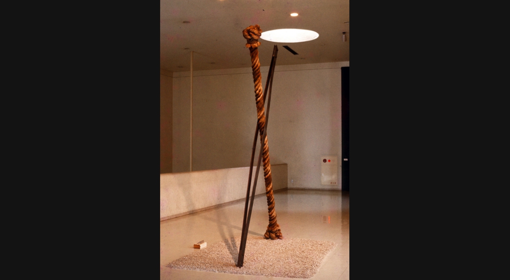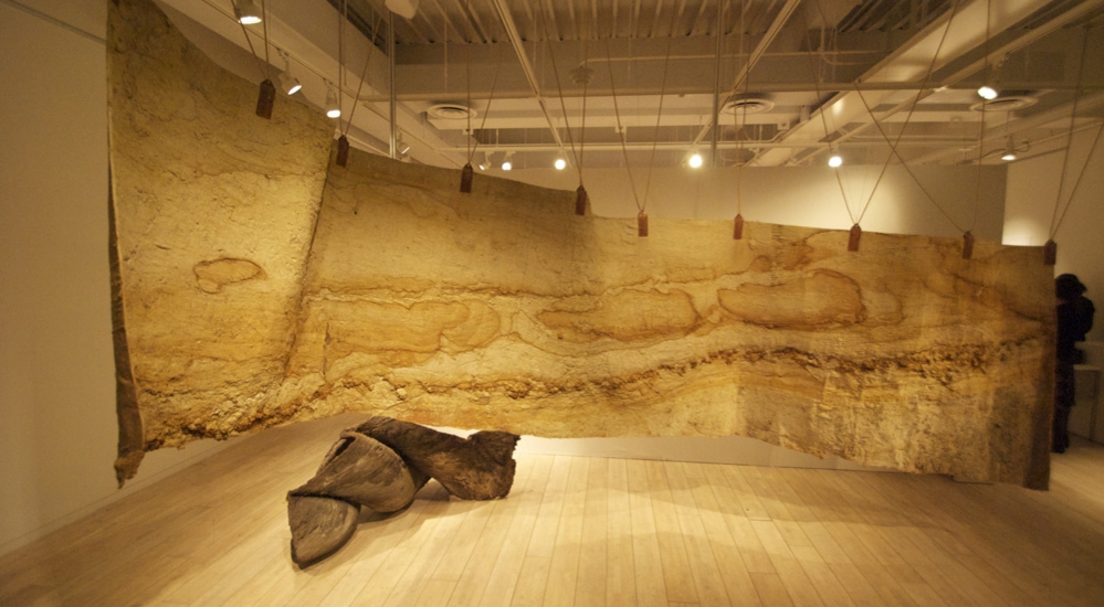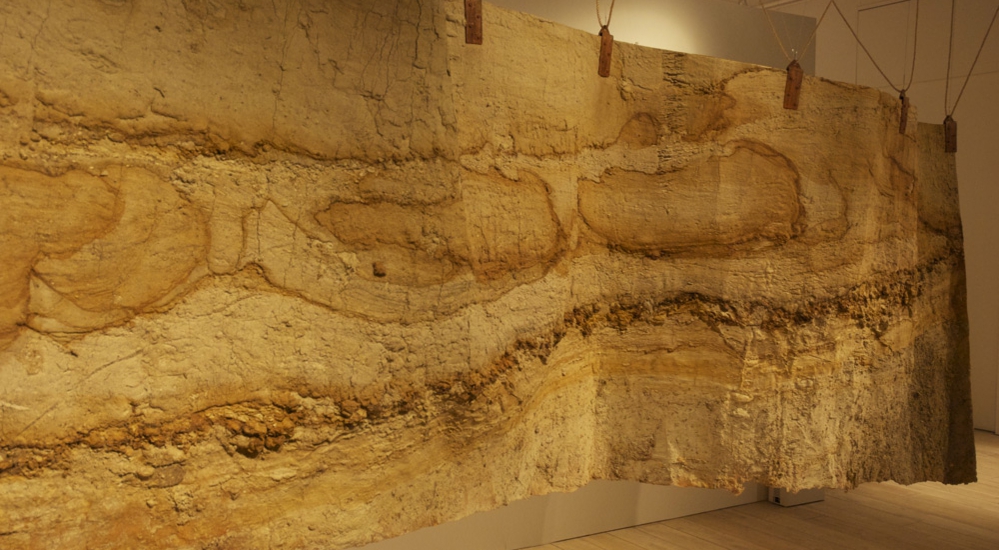 Material:Peeled real earth stratum from a bluff with textile and glue, sisal hemp rope, iron,
