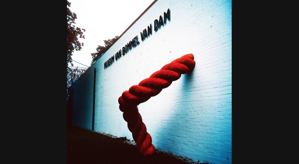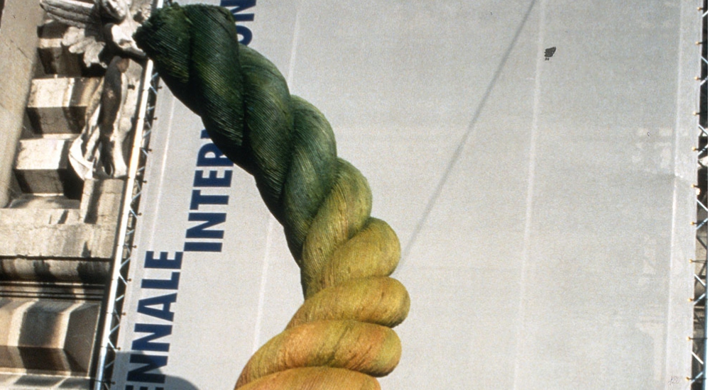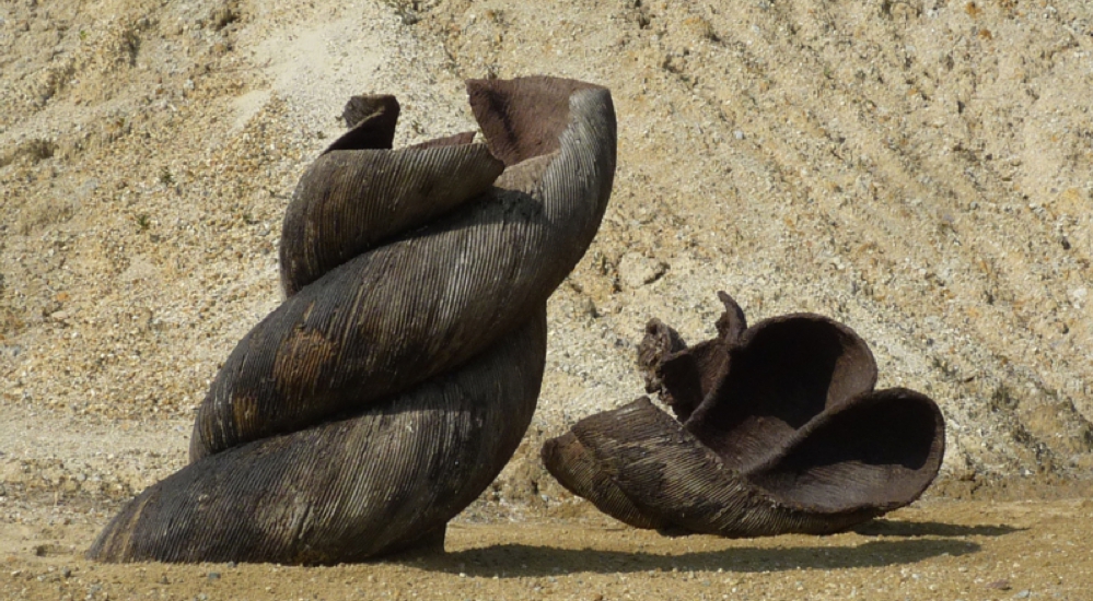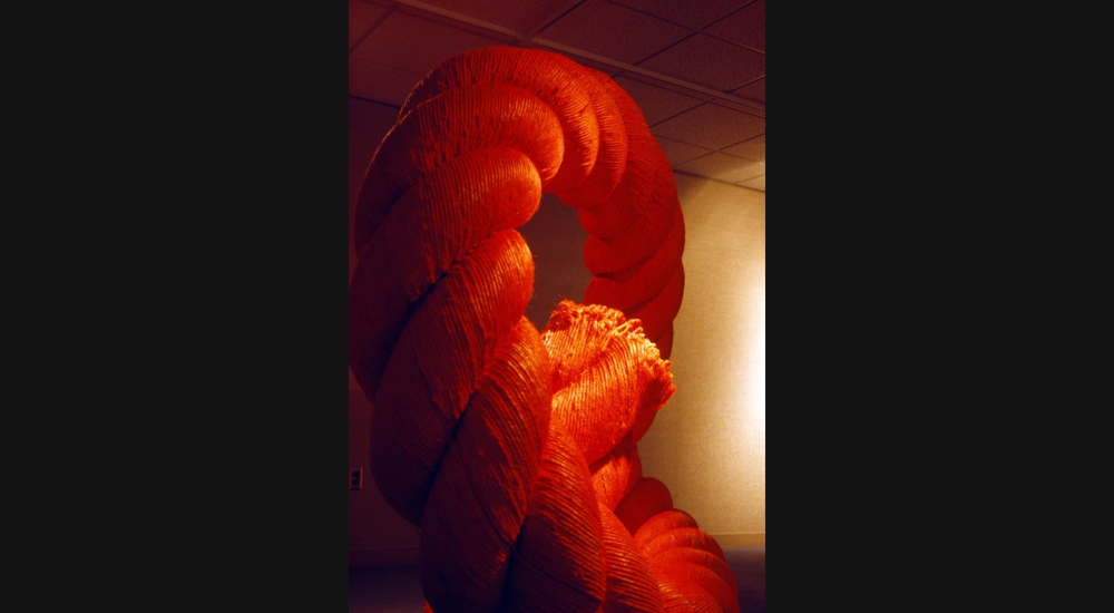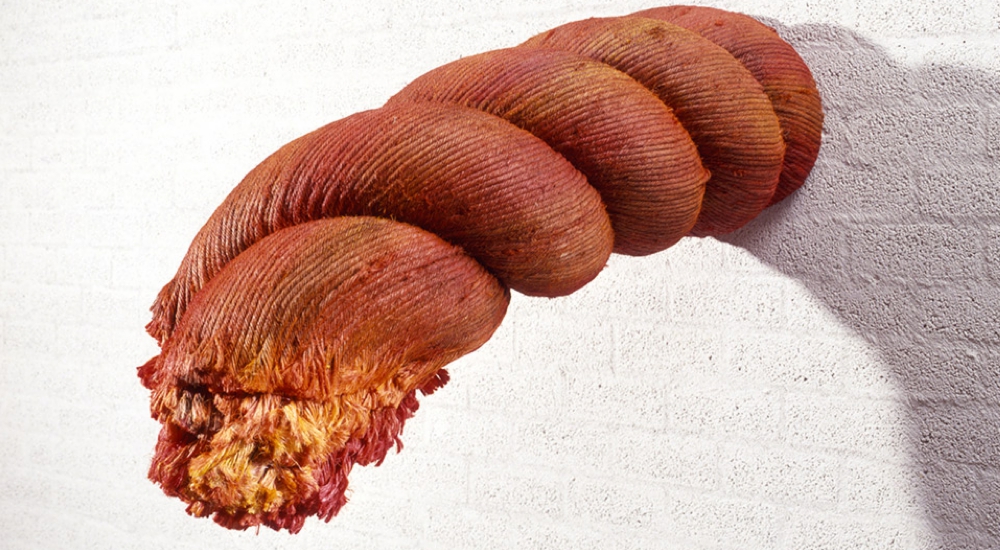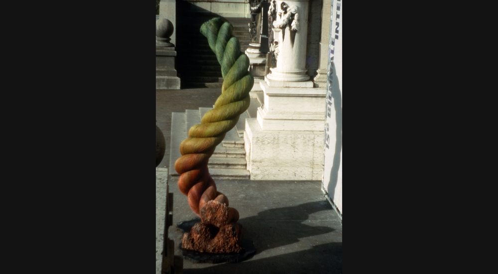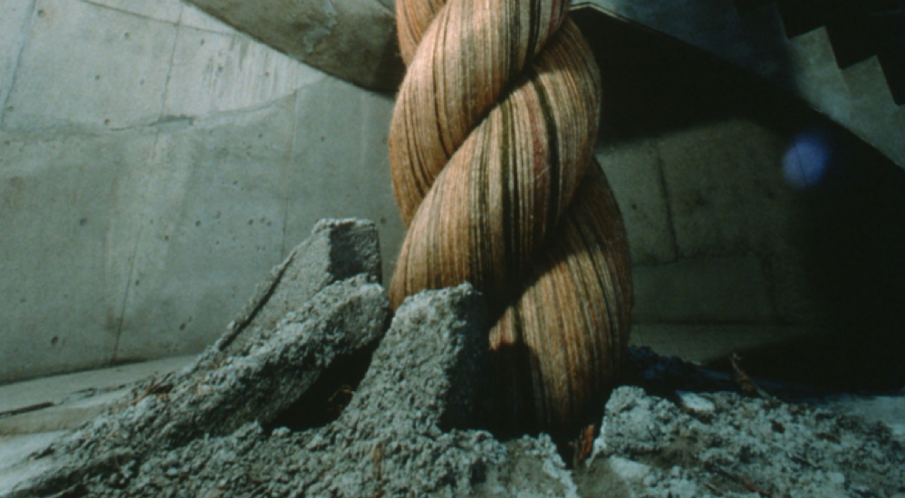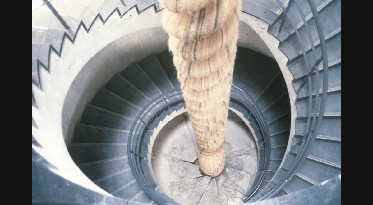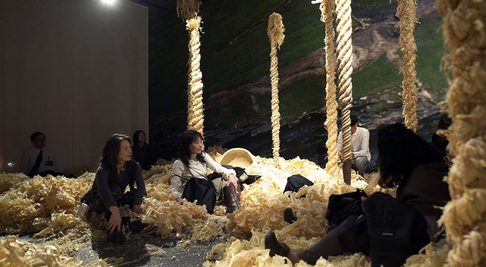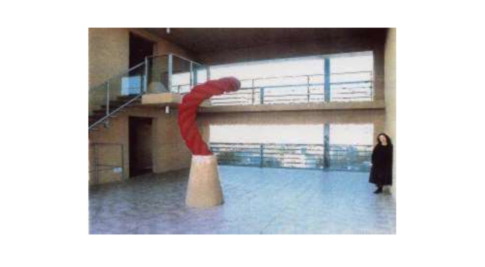 Material:Peeled real earth stratum from a bluff with textile and glue, sisal hemp rope, iron,