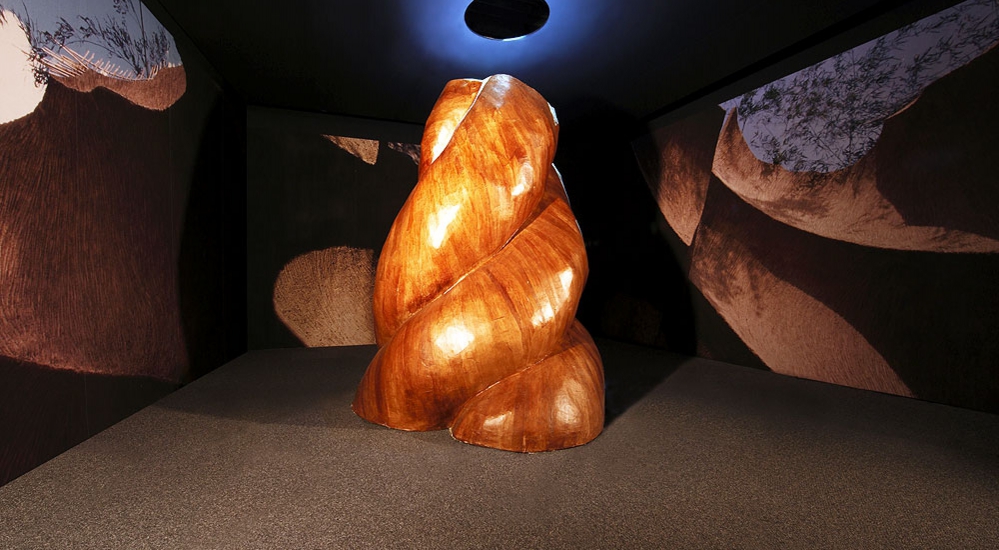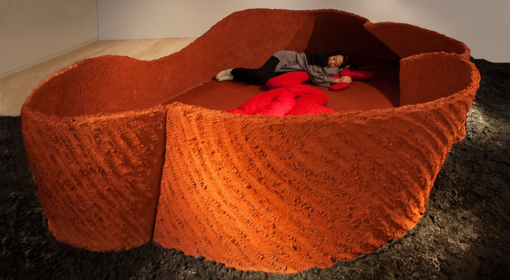 Materials: Mixed media: newspaper, earth Benigara pigment, hemp textile, charcoal, mica, cotton textile cushion