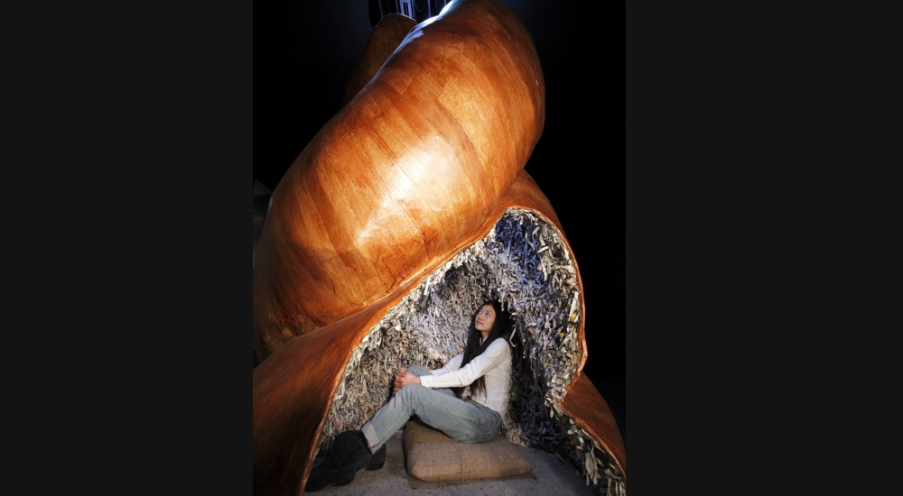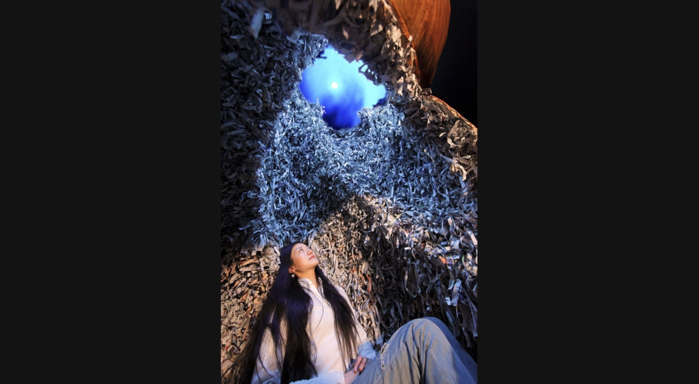 Material: old newspapers from around the world,cement paper bags, net , Kakishibu
