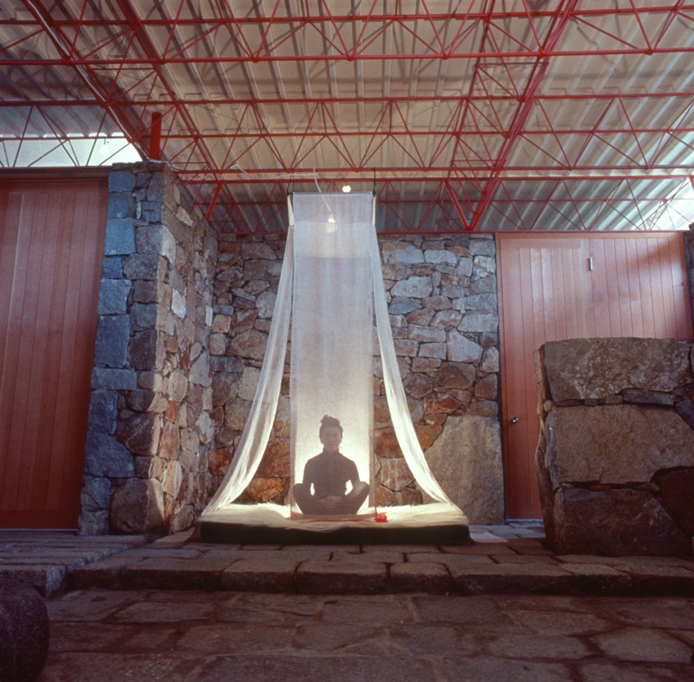 紗布のスクリーン1973年 からガルボシリーズへ 『光に包まれたい願望』イメージとして、障子のような効果の陰翳があり、光ゆらぐソフトな間仕切りとなる光のカーテンを制作。固い石やコンクリートの空間に対して、柔らかでスイングするカーテン状で醸し出す新たなスペースが生まれる。身体性のある物語る光の装置。従来のプロダクトデザインにない、「空間そのものを演出ししかも提灯のようにたたんで小さくコンパクトになる機能」にも優れた構造である。